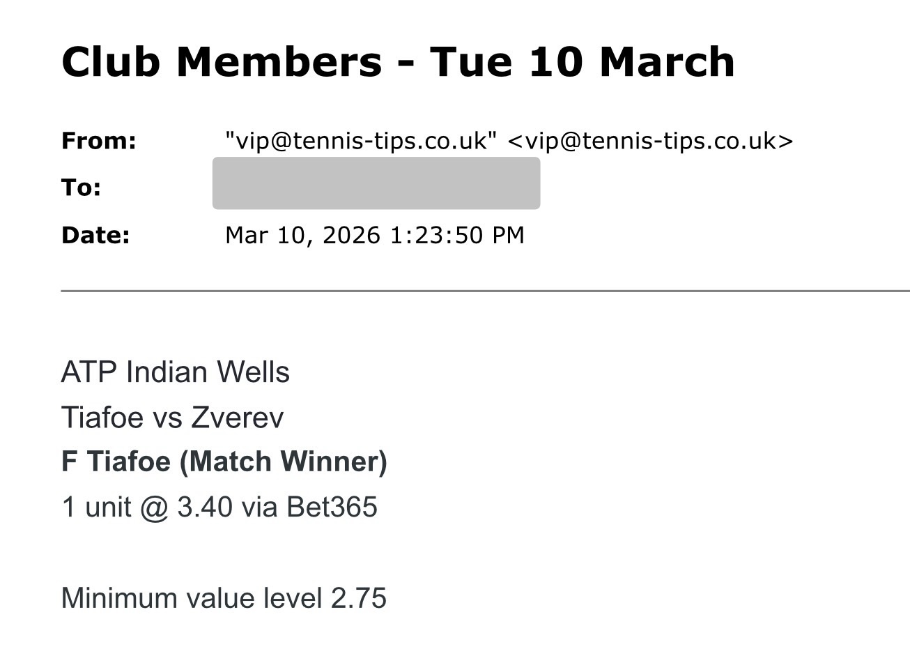 Who picks the advised bets?Tennis Tips UK have a team of analysts built over the past decade. Each has shown a proficiency in beating ATP, Challenger or Grand Slam markets consistently. See an example of the email format members receive below. To make the service more practical to follow we send out picks around 6 hours before the scheduled start time on average so it should be feasible to follow regardless of client timezone.