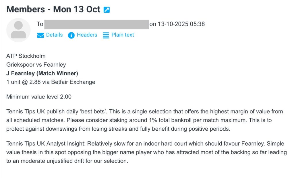 Follow @TennisTipsUKSynopsis: An email service where members receive daily betting picks direct to their inbox. This clearly states the match, specific bet and advised stake. There is a daily ‘best bet’ which is the highest value selection our team has found for that day. This is exclusively available through the full access plan.