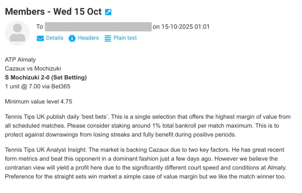 Follow @TennisTipsUKSynopsis: An email service where members receive daily betting picks direct to their inbox. This clearly states the match, specific bet and advised stake. There is a daily ‘best bet’ which is the highest value selection our team has found for that day. This is exclusively available through the full access plan.