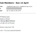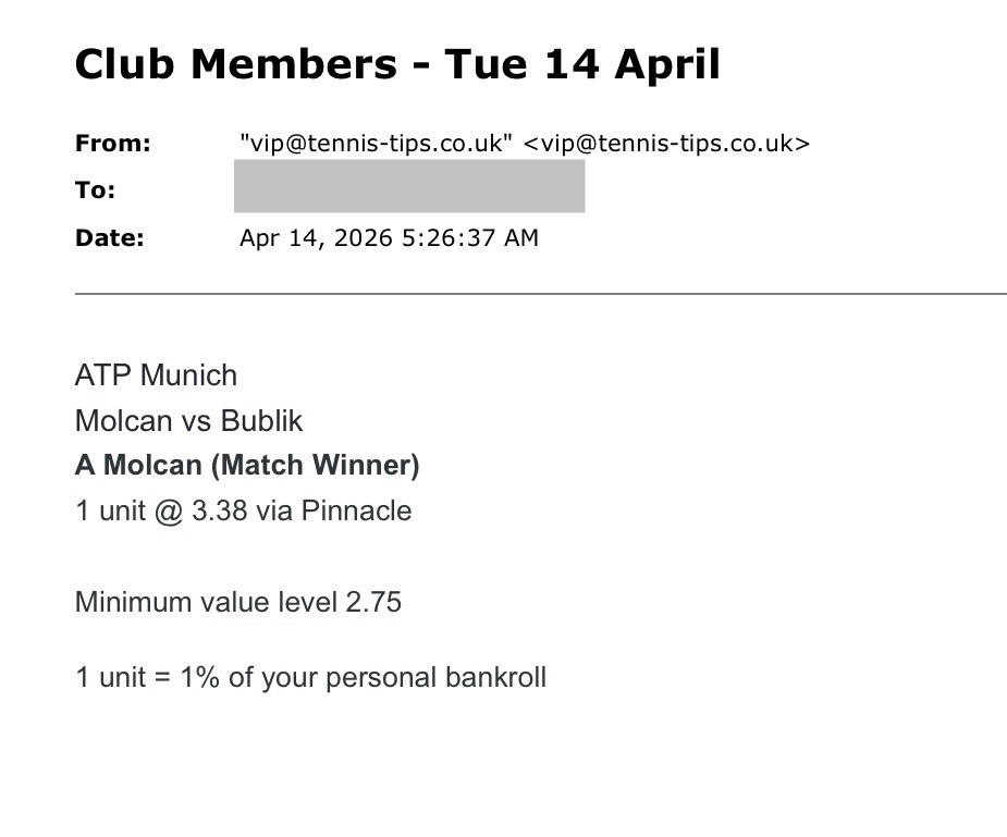 Tennis Tips UK have a team of analysts built over the past decade. Each has shown a proficiency in beating ATP, Challenger or Grand Slam markets consistently. See an example of the email format members receive below. To make the service more practical to follow we send out picks around 6 hours before the scheduled start time on average so it should be feasible to follow regardless of client timezone.