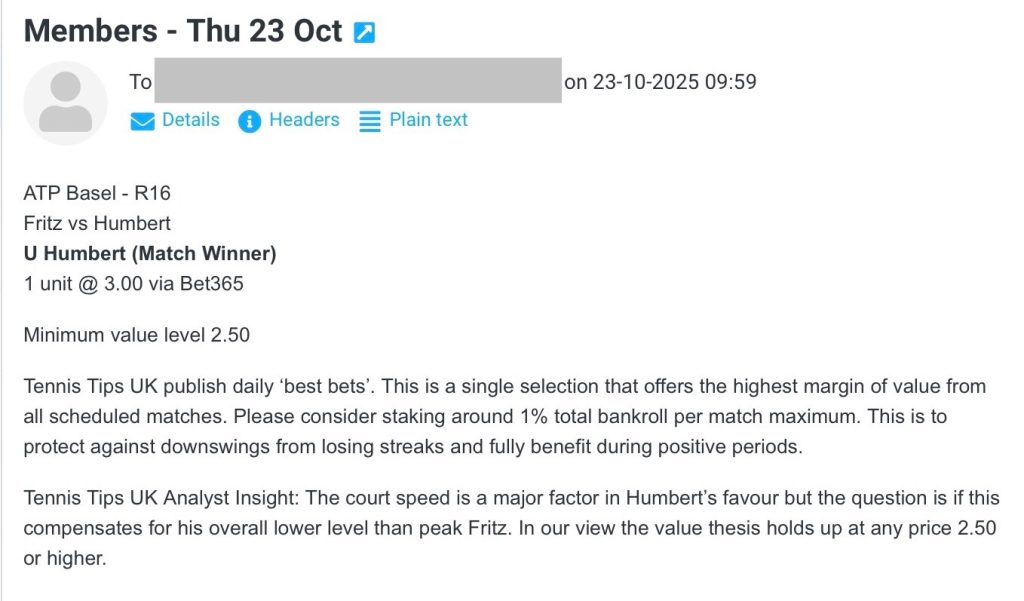 Who picks the advised bets?Tennis Tips UK have a team of analysts built over the past decade. Each has shown a proficiency in beating ATP, Challenger or Grand Slam markets consistently. See an example of the email format members receive below. To make the service more practical to follow we send out picks six hours before the scheduled start time on average so it should be feasible to follow regardless of client timezone.