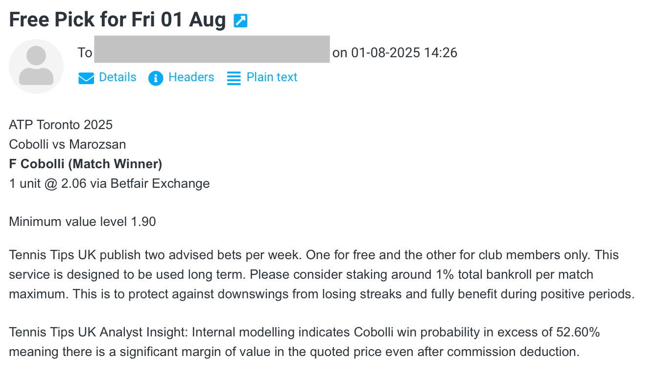 Who picks the advised bets?Tennis Tips UK have a team of analysts built over the past decade. Each has shown a proficiency in beating ATP, Challenger or Grand Slam markets consistently. See an example of the email format members receive below. To make the service more practical to follow we send out picks six hours before the scheduled start time on average so it should be feasible to follow regardless of client timezone.