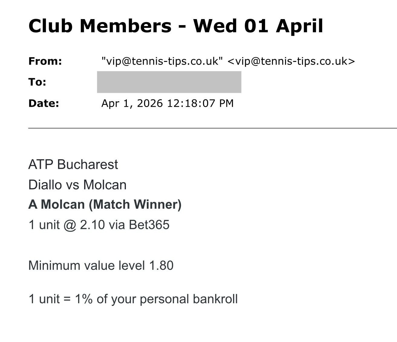 Tennis Tips UK have a team of analysts built over the past decade. Each has shown a proficiency in beating ATP, Challenger or Grand Slam markets consistently. See an example of the email format members receive below. To make the service more practical to follow we send out picks around 6 hours before the scheduled start time on average so it should be feasible to follow regardless of client timezone.
