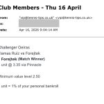 Who picks the advised bets?Tennis Tips UK have a team of analysts built over the past decade. Each has shown a proficiency in beating ATP, Challenger or Grand Slam markets consistently. See an example of the email format members receive below. To make the service more practical to follow we send out picks around 6 hours before the scheduled start time on average so it should be feasible to follow regardless of client timezone.