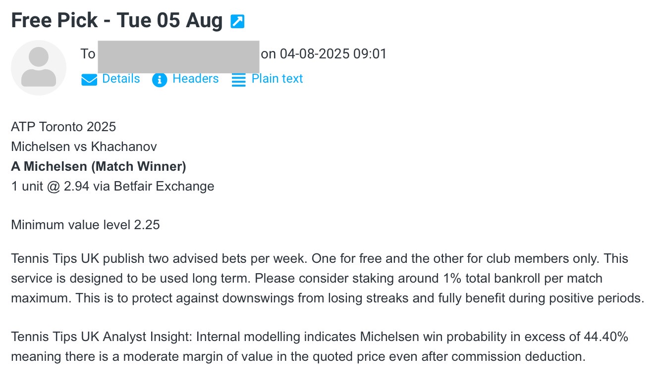 Who picks the advised bets?Tennis Tips UK have a team of analysts built over the past decade. Each has shown a proficiency in beating ATP, Challenger or Grand Slam markets consistently. See an example of the email format members receive below. To make the service more practical to follow we send out picks twelve hours before the scheduled start time on average so it should be feasible to follow regardless of client timezone.