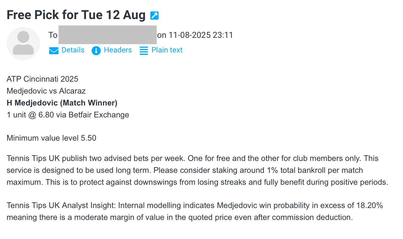 Who picks the advised bets?Tennis Tips UK have a team of analysts built over the past decade. Each has shown a proficiency in beating ATP, Challenger or Grand Slam markets consistently. See an example of the email format members receive below. To make the service more practical to follow we send out picks six hours before the scheduled start time on average so it should be feasible to follow regardless of client timezone.