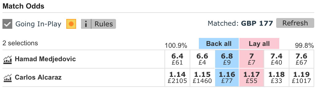 Tennis Tips UK include a screenshot of the betting exchange market as of publication. This serves as proof that the quoted odds are/were available and gives an indication as to liquidity levels. Simply click the image to enlarge and see full details.