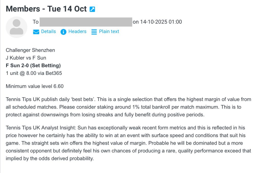 Who picks the advised bets?Tennis Tips UK have a team of analysts built over the past decade. Each has shown a proficiency in beating ATP, Challenger or Grand Slam markets consistently. See an example of the email format members receive below. To make the service more practical to follow we send out picks six hours before the scheduled start time on average so it should be feasible to follow regardless of client timezone.