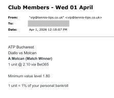 Who picks the advised bets?Tennis Tips UK have a team of analysts built over the past decade. Each has shown a proficiency in beating ATP, Challenger or Grand Slam markets consistently. See an example of the email format members receive below. To make the service more practical to follow we send out picks around 6 hours before the scheduled start time on average so it should be feasible to follow regardless of client timezone.